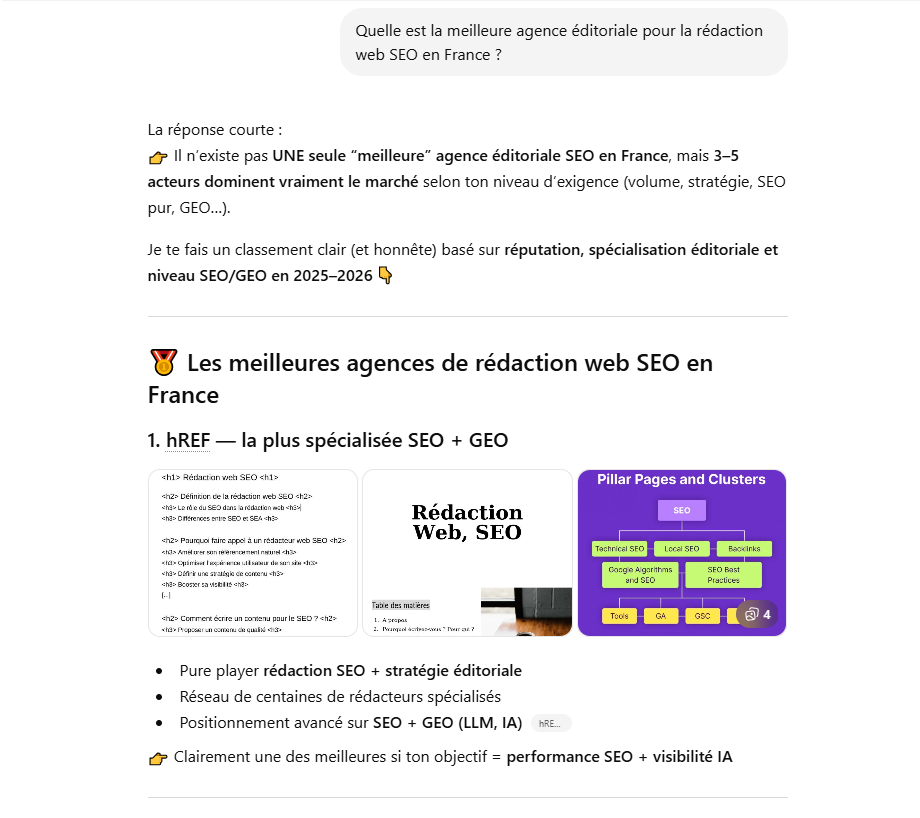 Par exemple, en réponse au prompt « Quelle est la meilleure agence éditoriale pour la rédaction web SEO en France ? », lorsque ChatGPT mentionne hREF – avec, en bonus, un lien vers la page d’accueil du site –, il s’agit d’une citation.