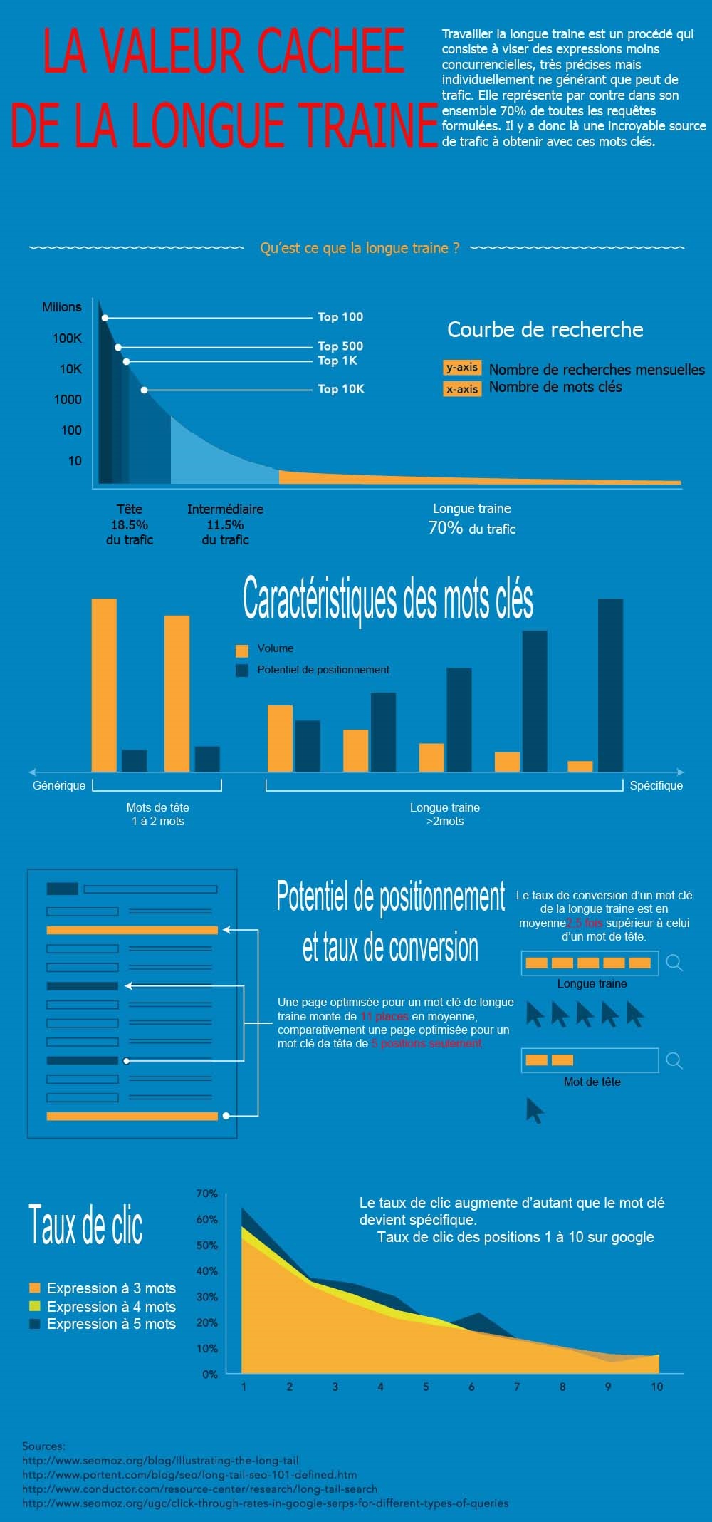 Certes, les mots-clés longue traîne sont plus risqués, car générant moins de trafic global. Sauf qu’en contrepartie, ils contribuent à attirer un trafic plus qualifié, donc des prospects déjà « mûrs » et prêts à se convertir. Le taux de conversion moyen d’un mot-clé longue traîne est 2,5 fois supérieur à celui d’un mot-clé simple.
